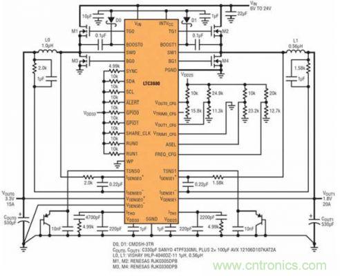 圖1:采用外部功率MOSFET的雙輸出穩(wěn)壓器