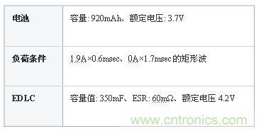這里我們列舉了使用EDLC來減輕電池負荷的具體事例。圖3是將電池以及EDLC的內(nèi)部電阻部分分離開,并做了明顯標(biāo)記的電路圖。為了使EDLC達到減輕電池負荷的作用,將EDLC和電池并聯(lián)連接。表1為評價條件。此處設(shè)定的負荷為設(shè)想的脈沖驅(qū)動的GSM和GPRS等通信、高輸出音頻、小型馬達等的峰值負荷。
