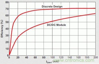 圖 5 顯示了 4.93 V 輸出電壓條件下圖 1 所示電路的紋波,而圖 6 將該電路的效率同具有穩(wěn)定輸出的集成 DC/DC 組件進(jìn)行了對(duì)比。