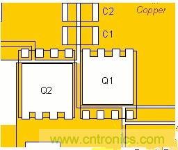 圖 4 顯示了一個近優(yōu)化布局實例,其中,輸入旁路電容 C1 和 C2(均為 1206 尺寸)橋接高側 Q1 漏極和低側 Q2 源(均為大金屬漏極焊盤 SO-8 尺寸)。