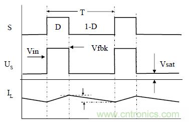 我們可以把BUCK電路的工作過程分成兩個階段,當(dāng)開關(guān)導(dǎo)通時,輸入電壓加到LC濾波器的輸入端,電感上的電流以固定斜率線性上升。電感上的電流用下面公式描述: