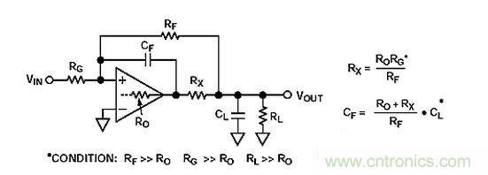 1. 環(huán)路外補(bǔ)償--超前補(bǔ)償(適用小容性負(fù)載1500pf或負(fù)載阻抗一定)在運放的輸出端和負(fù)載電容之間串入一個電阻RX,一般而言它的阻值為10-100歐姆。