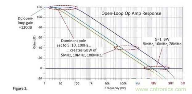 首先將DC開環(huán)增益設(shè)置為1M(120dB)。然后,主極點(diǎn)的頻率(單位為Hz)與其相乘將得到放大器的增益帶寬積(單位為MHz)。在這個(gè)例子中,10Hz的主極點(diǎn)對應(yīng)10MHz的增益帶寬積。對于5MHz,10MHz和100MHz三種不同的增益帶寬積,圖2分別給出了對應(yīng)的開環(huán)響應(yīng)。