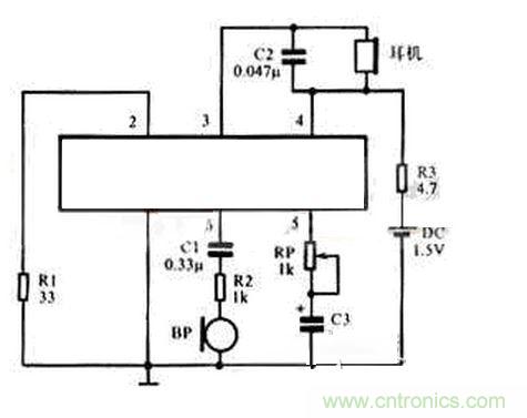 圖中LM386被連接成正相放大器電路。 1、8 腳接有10μF電容,故電路增益被提至最大。這樣做的原因在于LM386的增益不太大,用于助聽器時余量并不足,尤其當話筒靈敏度較差時比較明顯,調低增益常常不能滿足要求。話筒信號通過RP1和C1耦合至3腳,經LM386放大后從5腳輸出,再推動耳機發(fā)聲,RP1用于音量調節(jié),S1為頻響選擇開關。當 S1置于1、2、3位時,對應的電路頻響分別是3000、4500和6000Hz左右,該頻響選擇電路實際上是一電容衰減電路。設置它的目的是壓縮電路的頻響,減弱和消除耳聾者不需的音頻成分和噪音,以提高清晰度和減輕耳朵的疲勞感。C1為輸出耦合電容,C4為電源去耦電容。R1是駐極體話筒BP內場效應管的負載。