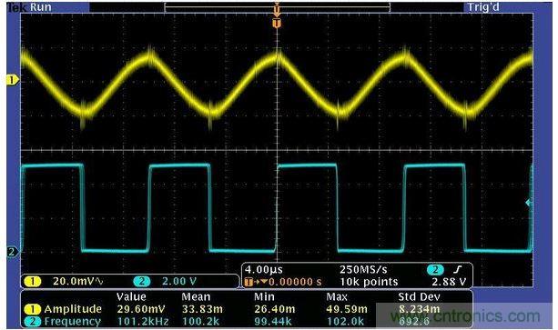 圖2和圖3的示波器波形展示了使用比較器IC1和IC4=TLC3702以及運(yùn)放IC3=TLC2272搭建的測(cè)試電路的性能。這些相當(dāng)極端的例子反映了電路處理差別極大的輸入信號(hào)的能力。