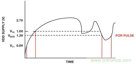 POR 電路有時會集成一個掉電檢測器(BOD),用于防止電路在電壓非常短暫地意外降低時發(fā)生復(fù)位,從而避免故障。實際上,掉電電路給POR模塊所定義的閾值電壓增加了遲滯,通常為300mV左右。BOD保證,當(dāng)電源電壓降至VT2以下時,POR不會產(chǎn)生復(fù)位脈沖,除非電源電壓降至另一閾值VBOD以下,如圖3 所示。