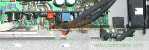 舉一個實例:某山寨小企業(yè)抄板了某個已成熟的逆變電路,此電路在別人那里反映不錯,而在自己這里的產(chǎn)品卻炸主功率MOS管的比例較高。攝氏25度環(huán)境時,輸出滿載1000W,10分鐘后圖4的B處(8個MOS管的中心位置)的溫度比A處高出6~8度!C處(綠圈)最低,比B處低14~15度。(C處為進風口,D為風扇,樣機為進風設(shè)計,據(jù)說是用以延長含油軸承的壽命),同樣型號并聯(lián)工作的功率MOS管,實際工作的溫差那么大,對“均流”極其不利,所以更提不上高可靠性。