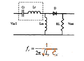 而當(dāng)副邊整流二極管處于截止?fàn)顟B(tài)時(shí),該結(jié)構(gòu)中的變壓器與副邊斷開,此時(shí)既沒有能量從原邊傳輸?shù)礁边叄琇m不再被副邊電壓箝位,此時(shí)諧振元件為諧振電感Lr、諧振電容Cr、激磁電感Lm,定義諧振頻率為: