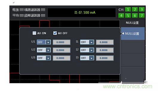 當NULL功能設置為ON時,NULL值設為之前測得的Udc和Idc(電壓/電流簡單平均的數(shù)值數(shù)據(jù))、Speed和Torque(安裝電機卡功能,傳感器的輸入信號為模擬信號時)。如果之前測得的Udc和Idc、Speed和Torque不存在,例如打開電源和NULL功能而沒有執(zhí)行測量,Udc和Idc將設為“0”。NULL功能的設置如圖2所示。