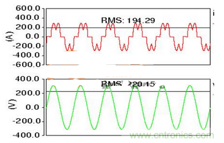 由上文中的公式,我們可以得出以下一個(gè)結(jié)論,那就是在6脈沖整流器的電流中,含6K(k為正整數(shù))次諧波,即5、7、11、13...等各次諧波,各次諧波的有效值與諧波次數(shù)成反比,且與基波有效值的比值為諧波次數(shù)的倒數(shù)。