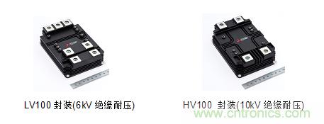 首次亮相展會的X系列雙管HVIGBT模塊,采用CSTBTTM 結(jié)構(gòu)的第7代IGBT和RFC二極管,降低功率損耗;運用可降低內(nèi)部電感的封裝技術(shù),優(yōu)化產(chǎn)品性能;使用兩種封裝(LV100/HV100),實現(xiàn)兩種絕緣耐壓(6kV/10kV),但兩者具有相同的外形尺寸。LV100封裝包括900A/1.7kV和450A/3.3kV;HV100封裝包括450A/3.3kV、330A/4.5kV和225A/6.5kV;可提高系統(tǒng)結(jié)構(gòu)設(shè)計的靈活性,方便實現(xiàn)逆變器擴(kuò)容。