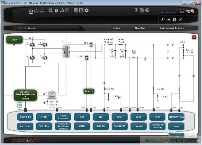 圖形用戶界面(GUI)是這種困境的一種解決方案。因?yàn)镚UI可簡化數(shù)字電源的編程。許多數(shù)字控制器IC供應(yīng)商均提供GUI。通常,GUI的設(shè)計(jì)方式能夠使電源專家直觀地使用它們。圖1顯示了這樣的圖形用戶界面。您可用鼠標(biāo)選擇電源的不同方面,在屏幕上的不同功能框圖中進(jìn)行不同的設(shè)置。