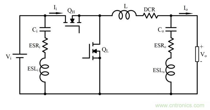 愛(ài)立信POL調(diào)節(jié)器通過(guò)使用如圖1所示的非隔離型同步降壓拓?fù)鋪?lái)實(shí)現(xiàn)。在降壓功率級(jí)的正常運(yùn)作期間,QH和QL交替開(kāi)關(guān),開(kāi)關(guān)次數(shù)由具有固定頻率PWM方案的控制電路來(lái)管理。由于輸出端的電感器/電容器組合作用,用于降壓功率級(jí)的輸出電流變得平滑。但是,由于在每個(gè)開(kāi)關(guān)周期中功率開(kāi)關(guān)QH電流從零至全負(fù)載進(jìn)行脈動(dòng),使得用于降壓功率級(jí)的輸入電流是脈動(dòng)或形成斬波。對(duì)于調(diào)節(jié)器的正確運(yùn)作及最大限度地減少來(lái)自開(kāi)關(guān)調(diào)節(jié)器的噪聲排放,輸入電容器顯然是至關(guān)重要的。