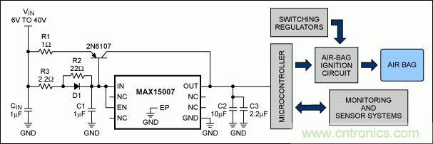 圖2. 該電路在MAX15007的外部增加了一個調(diào)整管,為氣囊監(jiān)測系統(tǒng)提供足夠的輸出電流。