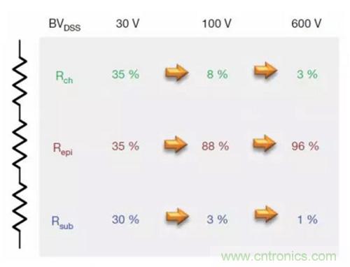 圖2顯示平面式MOSFET情況下構成RDS(on) 的各個分量。對于低壓MOSFET,三個分量是相似的。但隨著額定電壓增加,外延層需要更厚和更輕摻雜,以阻斷高壓。額定電壓每增加一倍,維持相同的RDS(on)所需的面積就增加為原來的五倍以上。對于額定電壓為600V的MOSFET,超過95%的電阻來自外延層。顯然,要想顯著減小RDS(on)的值,就需要找到一種對漂移區(qū)進行重摻雜的方法,并大幅減小epi電阻。