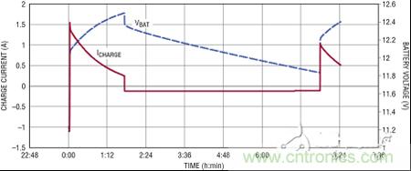 為了驗證電路功能,將一個數(shù)據(jù)記錄器連至充電器-電池系統(tǒng)。對電池電壓和電流進行采樣和存儲。為了方便電池的自放電并縮短放電時間,在電池端子之間連接一個 100Ω 電阻器。所產(chǎn)生的圖形如圖 3 所示。在周期一開始時,輸入電壓 VIN 被斷開,電池放電,并向負載提供“負”電流。然后,加上 VIN 后,充電周期啟動,“正”的充電電流流進電池。當電池充滿電以后,充電器關(guān)斷,電池開始自放電。當電池電壓達到最小值時,充電器接通,周期自我重復。