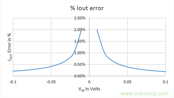 用一個精度為0.1%的電阻RSENSE進行精確度測試,測試結(jié)果用輸出電流誤差圖表示。測試的目標在于評估輸出電流范圍為+/-10mA時的性能。圖4繪出了輸出電流誤差與輸入電壓的關(guān)系圖。