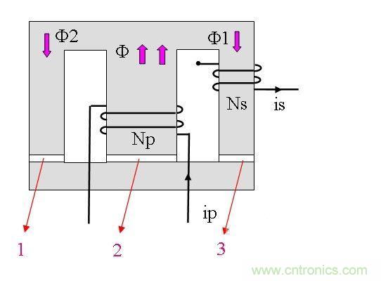 3、增加氣隙3,R1<R3,Φ1<Φ2,即耦合到Ns的磁通減少,漏感增大。