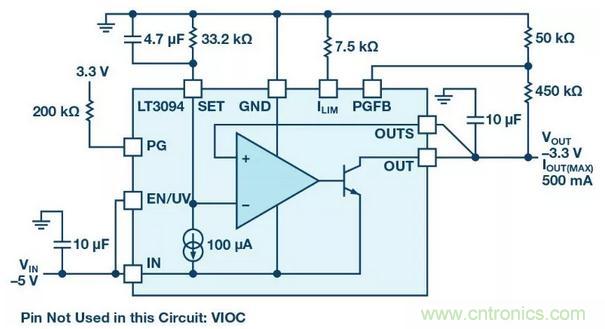 LT3094采用小尺寸、低成本的10μF陶瓷輸出電容工作,可優(yōu)化穩(wěn)定性和瞬態(tài)響應。利用單個電阻器可編程外部精密電流限值(±10%過溫)。該器件的VIOC引腳可控制前端穩(wěn)壓器,以最大限度地降低功耗并優(yōu)化PSRR。單個SET引腳電容可降低輸出噪聲,并提供基準軟啟動功能,防止輸出電壓在開啟時過沖。此外,該器件的內(nèi)部保護電路還包括具有折返功能的內(nèi)部限流和帶遲滯的熱過載。其他功能包括快速啟動功能(如果使用的SET引腳電容值較大,則非常有用)和電源良好標志(業(yè)界首款具有此功能的負輸出LDO穩(wěn)壓器),具有可編程閾值,用于指示輸出電壓調(diào)節(jié)。