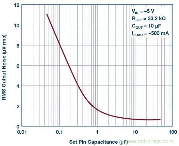 LT3094需要一個輸出電容才能保持穩(wěn)定性。鑒于其高帶寬,建議使用低ESR和ESL的陶瓷電容。為達到穩(wěn)定性,要求輸出電容最小值為10μF,ESR小于30mΩ,ESL小于1.5 nH。由于使用單個10μF陶瓷輸出電容可獲得高PSRR、低噪聲性能,而較大的輸出電容值僅僅略微提高了性能,因為穩(wěn)壓器帶寬隨著輸出電容的增加而降低,因此,使用比最小輸出電容值10μF更大的輸出電容并不會獲得多大的收益。盡管如此,較大的輸出電容值確實會降低負載瞬變期間的峰值輸出偏差。