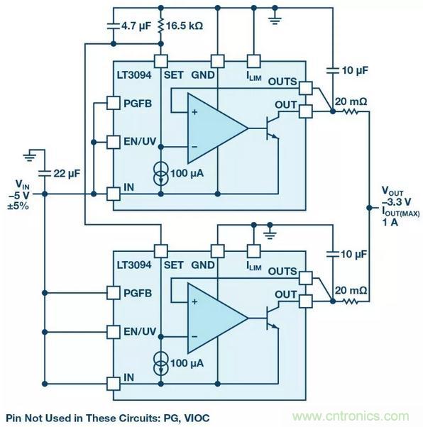 并聯(lián)多個LT3094可獲得更高的輸出電流。將所有SET引腳和所有IN引腳并在一起。使用小尺寸的PCB走線(用作鎮(zhèn)流電阻)將OUT引腳連接在一起,以均衡LT3094中的電流。也可以將兩個以上的LT3094進行并聯(lián),實現(xiàn)更高的輸出電流和更低的輸出噪聲。輸出噪聲的降低與并聯(lián)器件數(shù)的平方根成比例。并聯(lián)多個LT3094對于在PCB上散熱也很有用。對于具有高輸入至輸出電壓差的應用,也可以使用一個輸入串聯(lián)電阻或與LT3094并聯(lián)的電阻進行散熱。圖4所示為并聯(lián)電路實現(xiàn)方案。