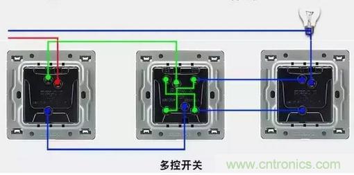 這里要新介紹一個開關(guān),叫做三控開關(guān)。開關(guān)布置的順序是,單開雙控→三控開關(guān)→單開雙控。先看個三控開關(guān)的圖,能更好理解,如下: