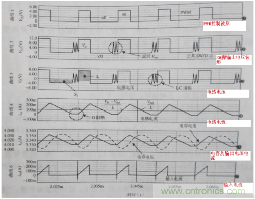 波形1表示PWM的波形,將開關管觸發(fā)成導通和截止狀態(tài)。當開關管SW導通時,公共點SW/D上的電壓為Vin。當開關管SW關斷時,公共點SW/D上的電壓為負壓,電感電流就會對二極管D產(chǎn)生偏置電流,出現(xiàn)負壓降——實現(xiàn)續(xù)流的作用。