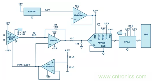 圖1中的電路顯示了帶有2.5MSPS和上游可編程儀表放大器的16位SAR轉(zhuǎn)換器,它將增益設(shè)置為1或100。通過在FPGA中進行過采樣和數(shù)字信號處理,該電路可實現(xiàn)大于125dB的動態(tài)范圍,并且仍然非常安靜。高動態(tài)范圍是通過AD8253的自動切換和過采樣實現(xiàn)的,其中信號的采樣速率遠(yuǎn)高于奈奎斯特頻率。
