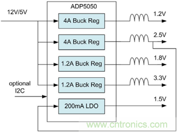 圖3顯示的是一個微型PMU(電源管理單元)。這款A(yù)DP5050采用來自AC-DC電源的12 V電軌供電。該PMU集成四個開關(guān) 穩(wěn)壓器以及一個線性穩(wěn)壓器。雖然體積緊湊,但它集成了 很多理想功能。單個降壓穩(wěn)壓器的開關(guān)頻率進行同步和相移,以便最大程度地降低輸入線路上的噪聲,并使用小輸 入電容。一個獨特的特性是兩個開關(guān)穩(wěn)壓器能以另外兩個 穩(wěn)壓器開關(guān)頻率的一半運行。這樣可以保持一個可預(yù)測的 低EMI曲線,同時允許低功率電軌以較高的開關(guān)頻率工作, 并在高功率電軌上使用較低的開關(guān)頻率以獲得最高效率。