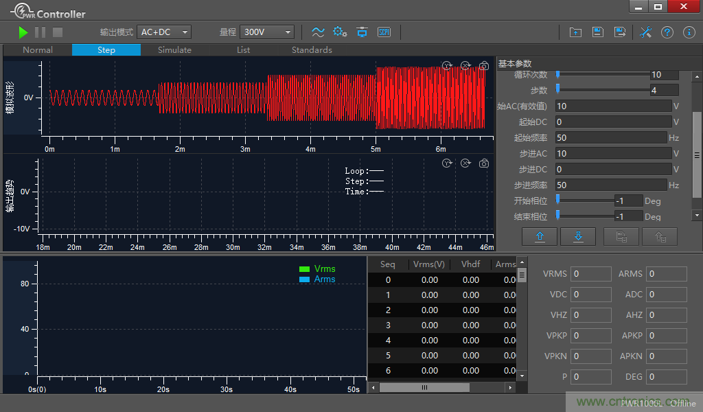步階功能(Step)可模擬電網(wǎng)停電、電壓下降(dip)、電壓上升(pop)等。步階功能(Step)輸出主要特點(diǎn)是設(shè)定簡單,輸出電壓、頻率規(guī)律變化的波形。實(shí)際使用時(shí)僅設(shè)置初始電壓與頻率、步進(jìn)電壓幅值、步進(jìn)頻率等即可實(shí)現(xiàn)目標(biāo)波形輸出,如下圖,初始10VAC/50Hz,步進(jìn)10VAC/50Hz的輸出波形。步階功能(Step)典型應(yīng)用是測試電子產(chǎn)品的工作電壓和頻率范圍。