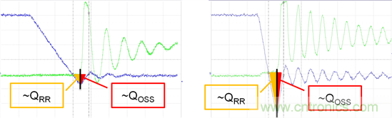 圖1:360A/µs(左側(cè))和2000A/µs(右側(cè))時,在CSD18531Q5A上測得的Qrr和QOSS值。