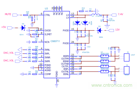CS83711在7.4V鋰電池供電內(nèi)置升壓到11.05V,能提供2×20W/3歐峰值輸出功率。并且CS83711整體效率高達(dá)90%,保證了輸出功率恒定、整機(jī)要求的播放時間、以及溫升在正常范圍之內(nèi)。CS83711另一個亮點是可以支持外接12V電源直供,方便整機(jī)預(yù)留外置12V電源線夾接口。CS83711還有其他豐富的功能以及性能:兩種防破音可選、擴(kuò)頻模式、過流保護(hù)、短路保護(hù)、過熱保護(hù)等;簡潔的EQA-28封裝生產(chǎn)也非常方便。