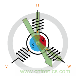圖 6:轉子的永久磁石會像被合成磁通量牽引一樣旋轉,電機的軸也會因此旋轉