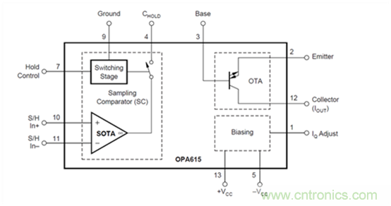 本文將繼續(xù)介紹另一款跨導放大器 — 電流模式放大器OPA615,并將介紹將其用于開發(fā)高輸出電流的電流脈沖源。對于本次實驗,將會使用鮮為人知的OPA615放大器。如果查看產品說明書,您就會發(fā)現(xiàn)這款放大器最初是作為模擬視頻功能的 DC 恢復功能開發(fā)的,幾年前被集成到更低功耗的更小外形封裝中。OPA615器件的優(yōu)勢在于它具有兩個跨導放大器和一個集成開關。這三個元件的結合能夠使器件具備極高的靈活性,實現(xiàn)納秒脈沖積分器以及采樣保持功能。開關速度很快,控制延遲時間為 2.5ns。查看圖 1 中的OPA615方框圖。