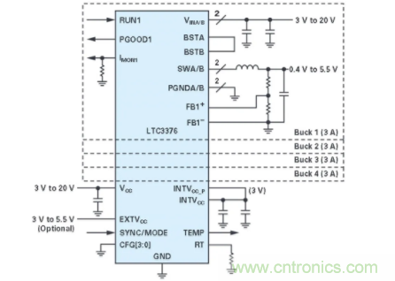 LTC3376具備4個獨立的降壓穩(wěn)壓器通道、8個可配置的1.5 A功率級、靈活的時序和故障監(jiān)測功能,總可用輸出電流為12 A,峰值降壓效率為96%,在所有通道上的輸出電壓精度為±1%。每個通道可由獨立的3 V至20 V輸入電源供電,輸出電壓的范圍最低可至0.4 V。相鄰輸出可通過單個共享電感并聯(lián)排列,以簡化電路。DC-DC轉(zhuǎn)換器通過CFG0到CFG3引腳進(jìn)行配置,由系統(tǒng)分配采用15種功率配置中的一種。無需采用外部BST電容,因為它們已被集成到封裝中。