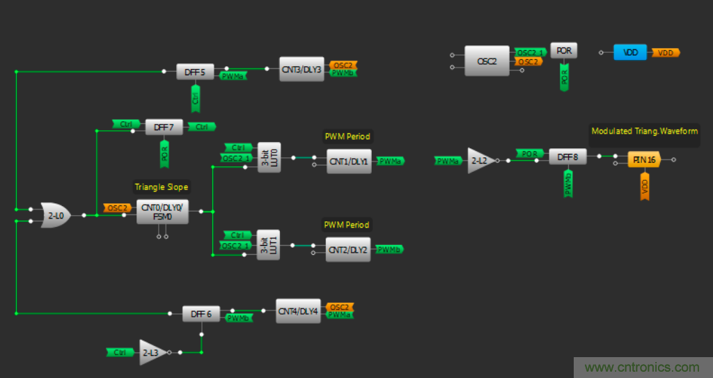 圖8. 三角波形發(fā)生器在GreenPAK Designer軟件中的實(shí)現(xiàn)