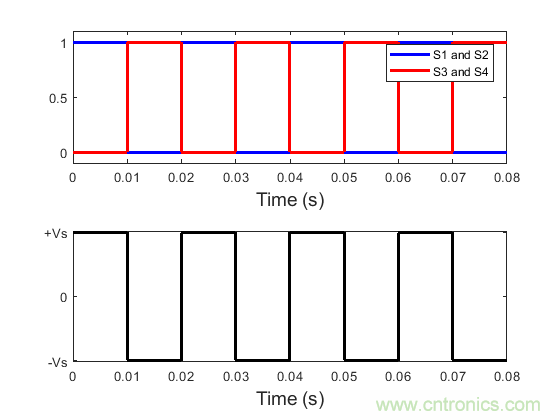 方波逆變器,已知為基礎(chǔ)逆變器,由兩個(gè)相位相反的方波運(yùn)行,其頻率等于輸出端所需的頻率。其中一個(gè)波施加到S1和S2,另一個(gè)波施加到S3和S4。圖2顯示了如果使用這類逆變器,PWM控制信號(hào)和在負(fù)載中獲得的電壓。