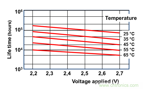 圖3:超級電容器不同溫度下的使用壽命與電容器電壓