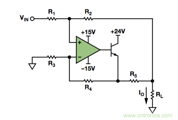 此處的輸出電流只是R3、R4和R5的函數(shù)。如果有理想放大器,電阻容差將決定輸出電流的精度。
