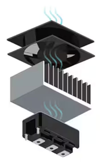 最有效的熱管理方法是將散熱器和強制通風相結合。IGBT 等半導體器件的內部熱阻通常極低,而該器件與周圍空氣之間的熱阻則相對較高。安裝散熱器可大幅增加向環(huán)境空氣散熱的可用表面積,從而降低熱阻。此外,在散熱器上引導氣流可進一步提高其能效。鑒于器件空氣界面是系統(tǒng)中最重要的熱阻,因此將其最小化至關重要。這種直接方法的優(yōu)勢在于無源散熱器的可靠性和風扇技術的成熟性。