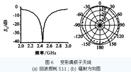 從圖5b 可以看到在天線軸方向上,天線幾乎無輻射. 如果此時讀寫器處于該方向上,應(yīng)答器將不會做出任何反應(yīng). 為了獲得全方位輻射的天線以克服該缺點,可以對天線做適當?shù)淖冃?如在將偶極子天線臂末端垂直方向上延長λ/ 4 成圖4c 所示. 這樣天線總長度修改為(57. 0 mm + 2 ×28. 5 mm) ,天線臂寬仍然為1 mm. 天線臂延長λ/ 4 后,整個天線諧振于1 個波長,而非原來的半個波長. 這就使得天線的輸入阻抗大大地增加,仿真計算結(jié)果約為2 kΩ. 其輸入回波損耗S11如圖6a 所示. 圖6b 為E 面(天線平面) 上的輻射場方向圖,其中實線為仿真結(jié)果,黑點為實際樣品測量數(shù)據(jù),兩者結(jié)果較為吻合說明了該設(shè)計是正確的. 從圖6b 可以看到在原來弱輻射的方向上得到了很大的改善,其輻射已經(jīng)近似為全方向的了. 電壓駐波比(VSWR) 小于2. 0 時的阻抗帶寬為12.2 % ,增益為1.4 ,對于大部分RFID 應(yīng)用系統(tǒng),該偶極子天線可以滿足要求.