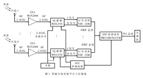 為了開展智能天線技術研究,結(jié)合實際情況,筆者設計了一個基于TI公司TMS320C6701數(shù)字信號處理器的智能天線實驗平臺。該平臺采用8單元天線陣列,工作頻率為2.4GHz,采樣速率為1.5MHz,采用TI公司的TMS320C6701EVM作為數(shù)字波束成形和控制算法實現(xiàn)單元,用于在實際信號環(huán)境下智能天線控制算法測試、MIMO技術研究和其他陣列信號處理技術的研究。實驗平臺的上行通道如圖1所示,下行通道如圖3所示。