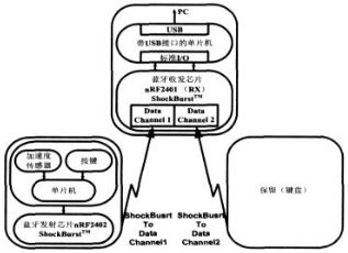 鼠標具體的工作原理為:鼠標內(nèi)的單片機實時監(jiān)測加速度傳感器的移動和按鍵狀態(tài),當鼠標器的狀態(tài)發(fā)生變化時,單片機讀出按鍵狀態(tài)并及時得到當前X/Y坐標移動的位置;接著單片機就將變化的數(shù)據(jù)按照約定的通信協(xié)議將數(shù)據(jù)打包通過無線收發(fā)技術發(fā)送到接收端,接收端通過單片機解碼把符合鼠標USB協(xié)議的數(shù)據(jù)包送至PC主機的USB端口;PC中的鼠標驅(qū)動程序接收到端口的數(shù)據(jù)包后將其解碼再傳送給相應的應用軟件,從而完成鼠標器的檢測和控制過程。