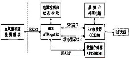 MCU部分是WPAN通信模塊的核心,完成通信模塊各組成部分的控制、協(xié)調(diào)和數(shù)據(jù)的加工。具體功能:通過RS232接口與血氧飽和度檢測模塊通信,實現(xiàn)對它的控制和配置,并接收檢測數(shù)據(jù);通過SPI接口和狀態(tài)指示接口實現(xiàn)對RF收發(fā)器的配置和檢測,并完成發(fā)射和接收的數(shù)據(jù)交換;通過USART接口與數(shù)據(jù)存儲器連接,完成數(shù)據(jù)存儲器的讀寫操作;通過電源檢測和狀態(tài)指示部分,監(jiān)測電源電壓情況,并能通過狀態(tài)指示產(chǎn)生報警提示?! ?br />