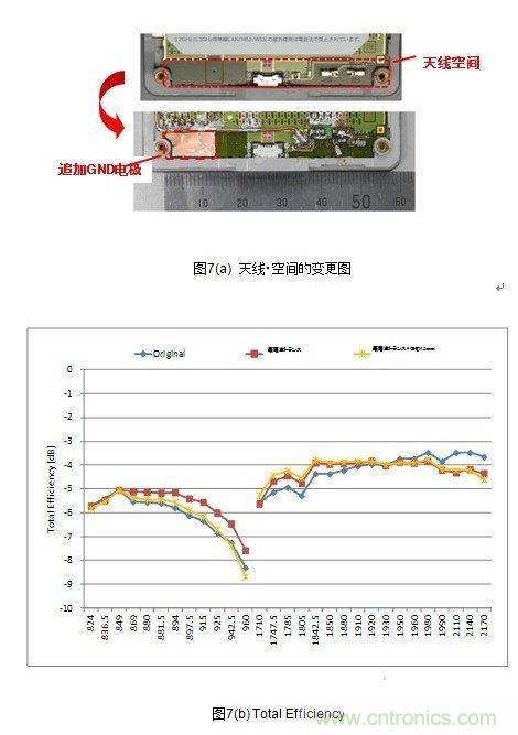 接下來將針對天線小型化的有效性進行檢測。一般來說天線具有改善接地距離的特性。但是,天線占據(jù)空間(排除了GND領(lǐng)域)很大的話天線以外的元器件安裝空間就會受壓迫。天線小型化和縮小天線空間迫在眉睫。當(dāng)天線空間的一部分被GND占據(jù),對這時候的天線特性的變化進行評價。天線空間的寬度為52mm,其中13mm被GND占據(jù),lowband的特性劣化,變成了跟LC電路等同的TotalEfficiency(圖7(b))。這就意味著實際上天線空間的面積可減少25%。