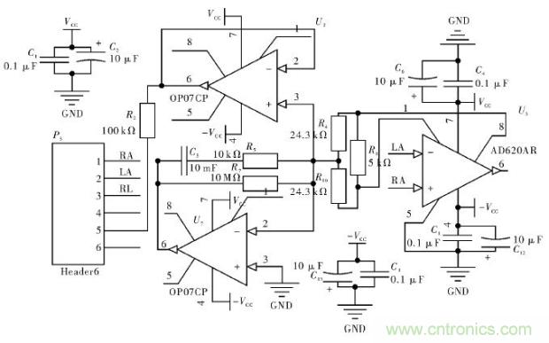 前置放大電路是模擬信號采集的前端,也是整個電路設(shè)計的關(guān)鍵,它不僅要求從人體準確地采集到微弱的心電信號,還要將干擾信號降到最低,由于心電信號屬于差分信號,所以電路應(yīng)采用差動放大的結(jié)構(gòu),同時要求系統(tǒng)具有高共模抑制比、高輸入阻抗、低漂移等特點。因此,選擇合適的運算放大器至關(guān)重要,這里選擇儀用運放AD620實現(xiàn)前置放大,AD620具有高精度、低噪聲、低輸入偏置電流低功耗等特點,使之適合ECG監(jiān)測儀等醫(yī)療應(yīng)用。AD620的放大倍數(shù)由1與8腳之間的反饋電阻決定,增益G=49.4 kΩRG+1,由于心電信號中含有較大的直流分量,因此前置放大電路的放大倍數(shù)不能過大,在這里選擇放大約10倍,因此反饋電阻R6取約5 kΩ,為提高電路的共模抑制能力,這里用一個OP07檢測R10,R4上的共模信號驅(qū)動導(dǎo)線屏蔽層,消除分布電容。同時用另一個OP07運放和R5,C3,R7組成右腿驅(qū)動電路,在R10,R4上檢測到的共模信號經(jīng)反相放大器后經(jīng)R7,反饋到人的右腿,進一步抑制了共模信號和50 Hz工頻干擾,這里右腿驅(qū)動有一個對交流電的反饋通路,交流電的干擾可能對人體產(chǎn)生危害,因此這里要注意做好絕緣措施,同時保護電阻R7盡可能大,取1 MΩ以上。此外系統(tǒng)電源的不穩(wěn)定也對心電信號的采集有較大影響,因此在本系統(tǒng)中,所有運放的電源腳都并聯(lián)兩個0.1μF和10μF的電容退耦,提高系統(tǒng)的穩(wěn)定性,前置放大電路的電路圖如圖3所示。