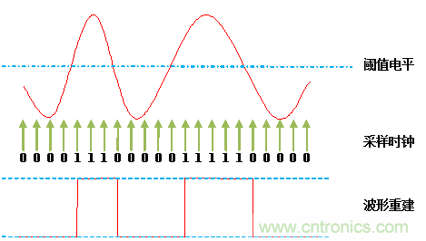由于邏輯分析儀不像示波器具有許多電平等級,通常只顯示兩個值(邏輯“1”和“0”)。如圖2所示設(shè)定了門限電壓后,邏輯分析儀將被測信號通過超高速比較器與門限電壓進行比較,高于門限電壓為邏輯“1”,低于則為邏輯“0”。例如:一個待測信號使用500MHz采樣率的邏輯分析儀,當(dāng)參考電壓設(shè)定為1.7V時,在測量時邏輯分析儀就會平均每隔2ns(500MHz)采樣一個點,超過1.7V為“1”,低于則為“0”,把所有采樣得到的“1”和“0”按照時間關(guān)系連接成一個波形,用戶便可在此連續(xù)波形中找出異常之處。