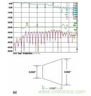 圖 4 提供了一個簡單實例。圖4a 是一根具有狹長漸變線的粗微帶傳輸線。漸變線在板邊處寬0.018"(0.46 mm),長0.110"(2.794 mm),最后變成了寬0.064"(1.626 mm)的50 Ω 線寬。在圖4b 和4c 中,漸變線的長度變短。選用了現(xiàn)場可壓接終端連接器,未焊接,所以每種情況均使用同一內(nèi)導(dǎo)體。微帶傳輸線長2"(50.8 mm),加工在厚30mil(0.76 mm)的RO4350B ™微波電路層壓板上,介電常數(shù)為3.66。在圖4a 中,藍(lán)色曲線代表插入損耗(S21),波動很多。相反,圖4c 內(nèi)S21 的波動數(shù)量最少。這些曲線表明,漸變線越短,性能越高。
