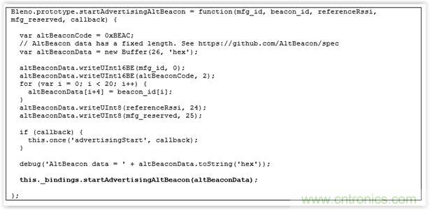 這一代碼基本上就是將必須的AltBeacon數(shù)據(jù)填充到緩沖區(qū),然后調(diào)用添加至Linuxbindings.js源文件中其他功能。Bleno可以與Linux上的BlueZ藍(lán)牙協(xié)議棧協(xié)作,當(dāng)在基于Linux的平臺上執(zhí)行功能時,Bleno所引出的用于多種應(yīng)用的功能最終被映射到針對BlueZ功能的調(diào)用。我只好對Bleno中Linux相關(guān)的部分作一些修改,這樣才能支持AltBeacon。
