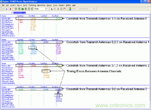 生成的MIMO信息表(圖8所示)顯示定時誤差目前在134nS之內(nèi)(僅為循環(huán)前綴的2.8%),可確保RS信號之間保持正交?,F(xiàn)在正確顯示的天線串擾值反映了圖3中已建模的天線串擾。